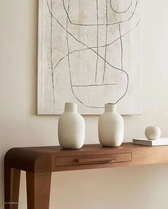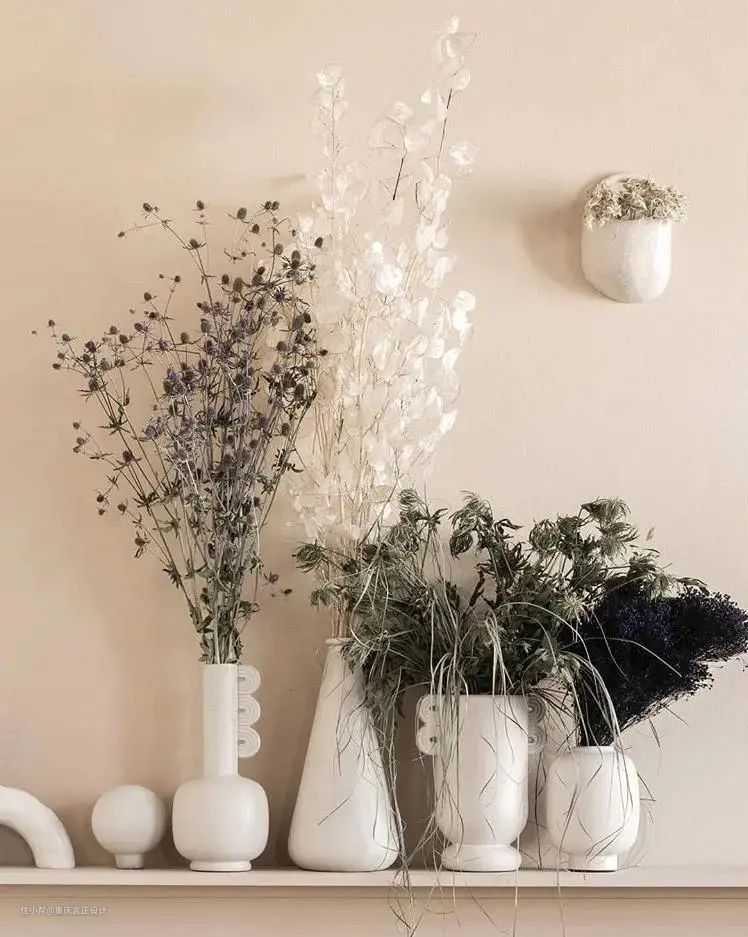 线条柔和的陶器花瓶与奶茶裸色背景墙是最佳搭档。