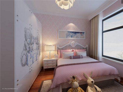 很明显,此图描绘的是家中小孩居住的房间,整个装扮成了甜美的粉色,可看出这里的主人是一个小姑娘,如花园一般,洋溢着娇嫩和活泼。靠墙而立的大衣柜上描绘着卡通图案,与散落地毯上的玩具相互呼应,增添了些许童趣。
