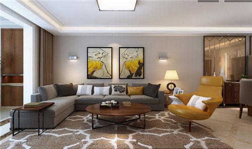 第一张图中描绘的是会客区,整体空间还算宽敞,深灰色布料沙发L型的倚墙摆放,与灰褐的墙面和地毯一同为客厅增添了些许暖意,明黄单人椅与墙面画作呼应,活泼了空间氛围,简易的褐色边几愈发显得姿态典雅。