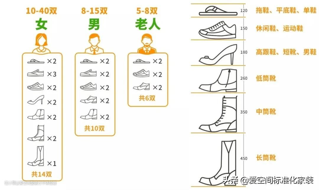 一家三口,大约有20-60双鞋子,深度按照最大的鞋子算,一般是350mm以下,可以放下46码以下的鞋子。