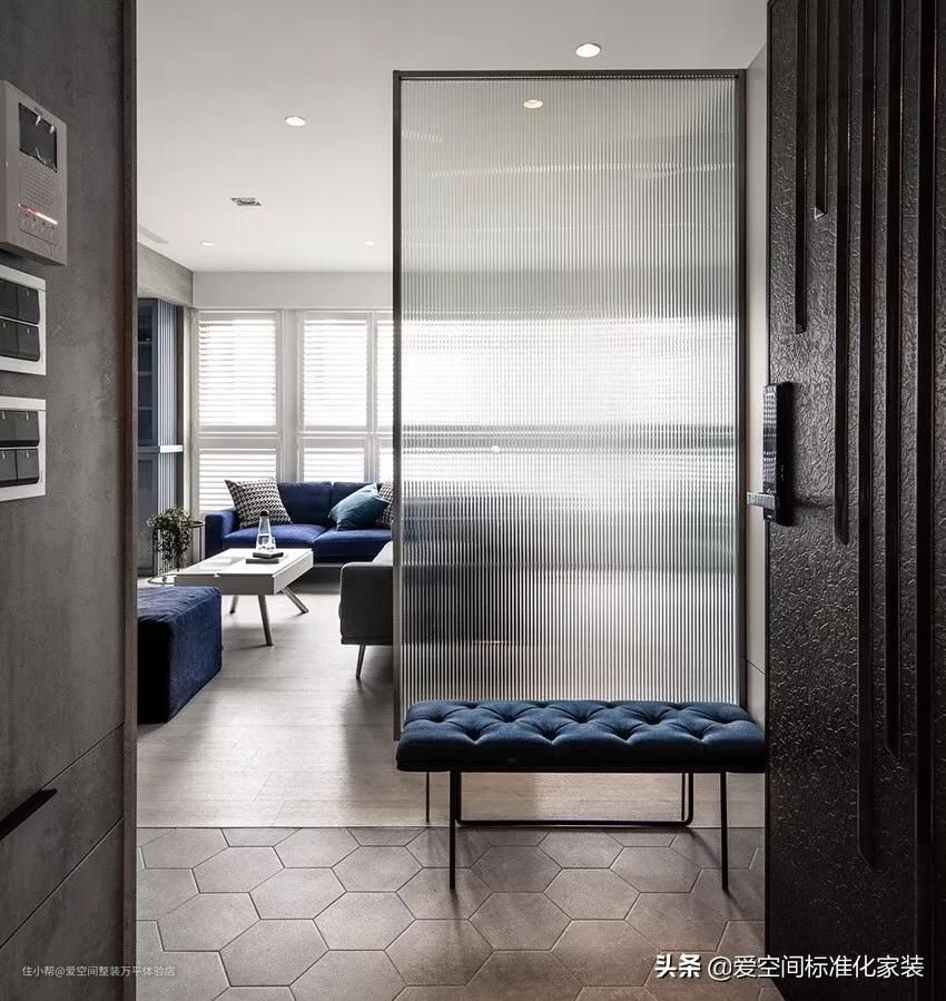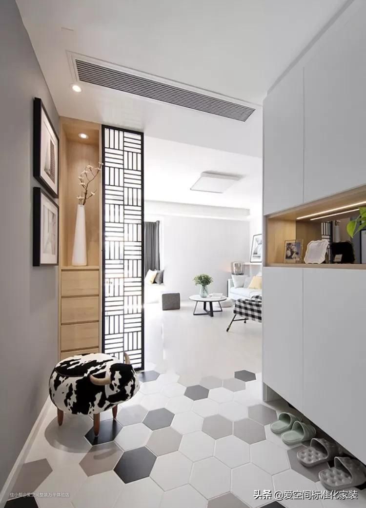 还有一种方式是通过铺地毯或者铺贴不同种类的瓷砖,将玄关区域和厅分隔开来,虽然视线上没有遮挡,但是让人从心理上有了一个从室外到室内的过渡,瞬间拥有回家的仪式感。