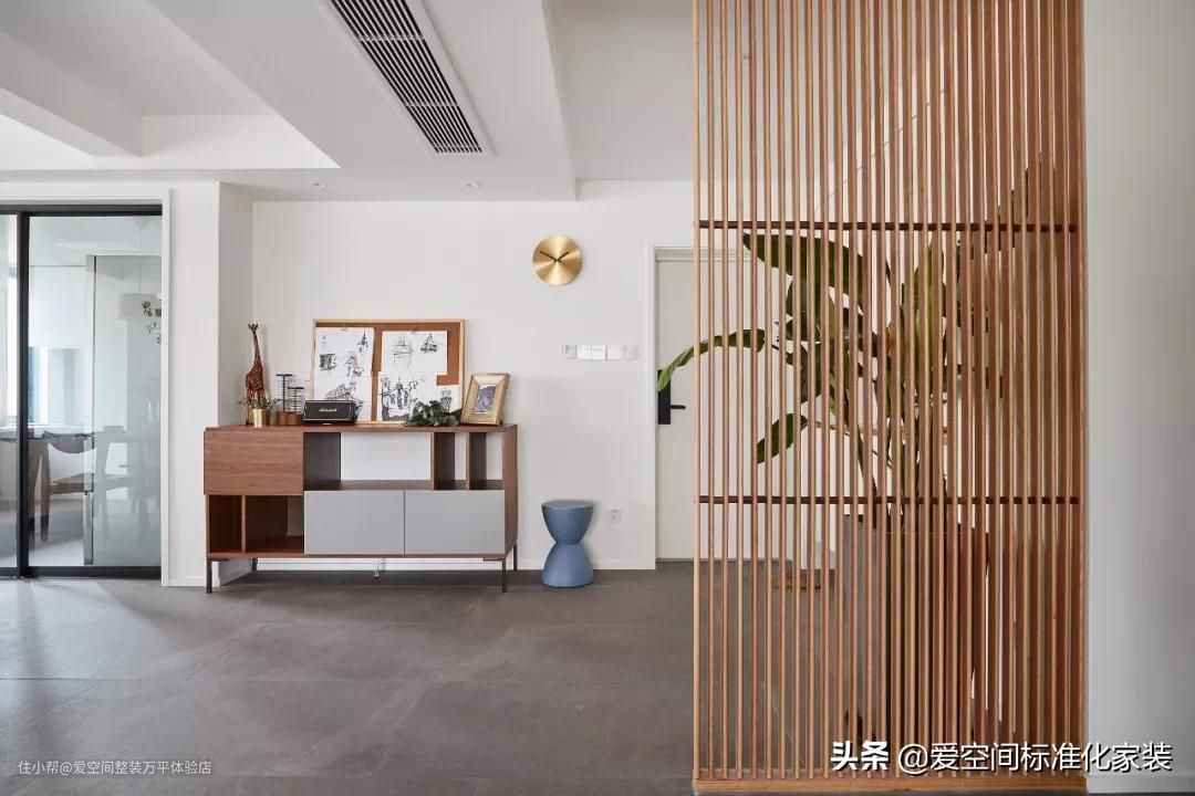 利用隔断,将家里的入户杂物区和客餐厅分开,让在入口处和步入室内间有个缓冲区域。
