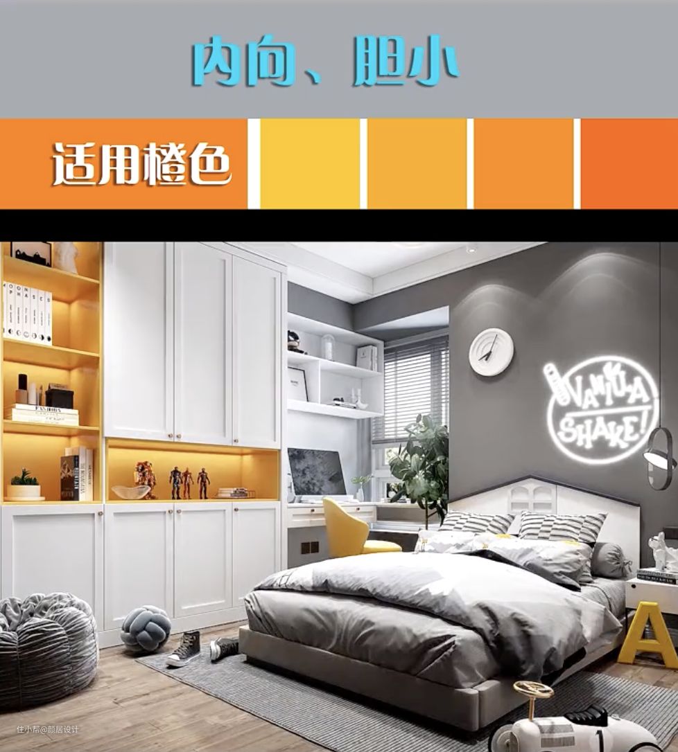 二、性格内向、胆小的孩子,适合用橙色。这种温暖、极具活力的颜色,能鼓励孩子自信、阳光和独立。
