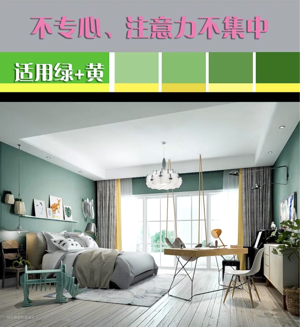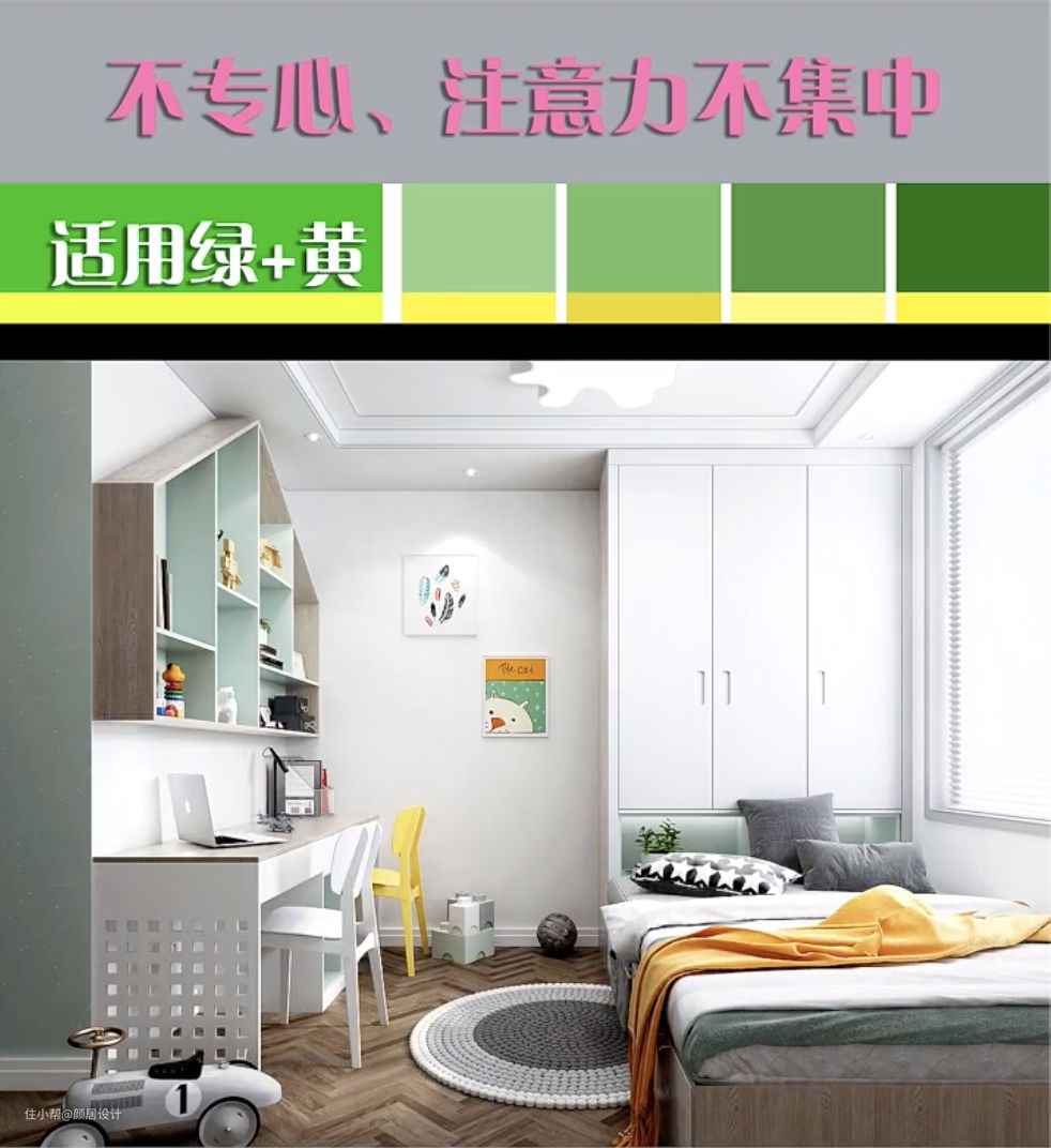 三、学习不专心、注意力不集中的孩子,可以使用绿色,再点缀点黄色,大自然的绿色可以静心凝神、舒缓情绪,点缀的黄色则有积极向上的作用。
