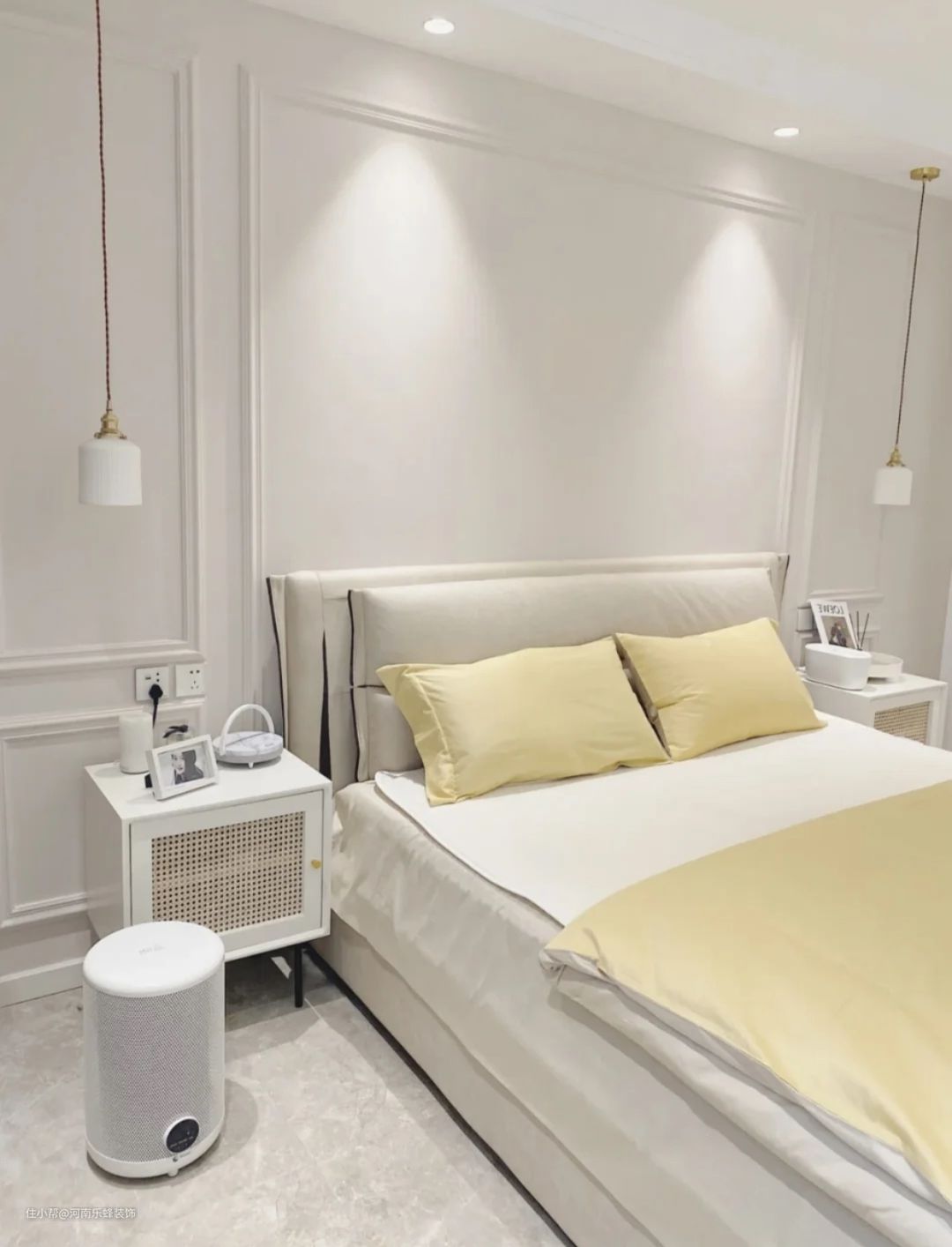 天花板吊灯十射灯十主灯的灯饰设计让整个空间都亮晶晶的,满满少女心心简单洁白又亮晶晶的卧室,哪个仙女不爱呢?