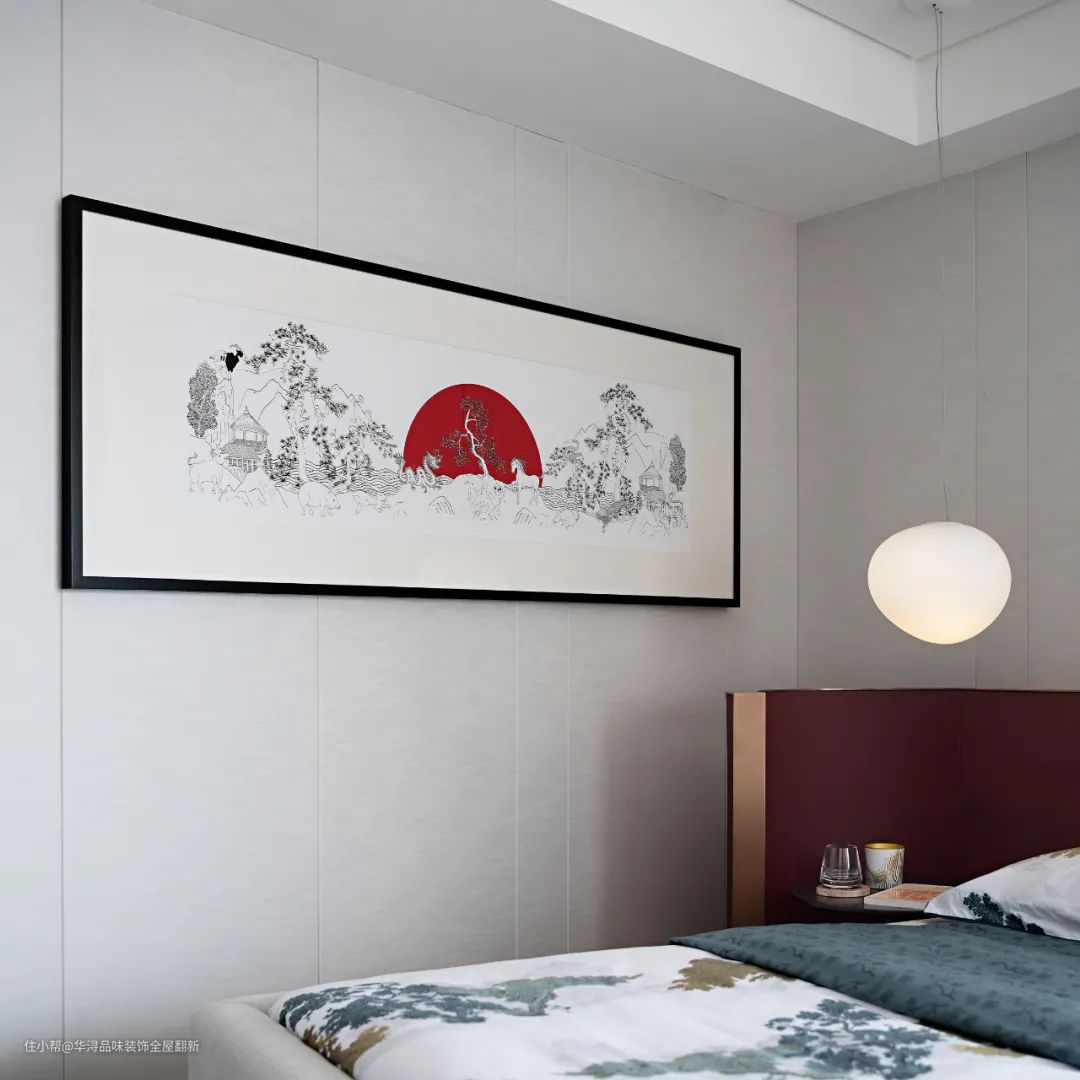 ▲卧室侧边墙面以硬包为主,挂一幅群山旭日东升的横幅装饰画,旁边还有一盏球形的吊灯布置,带来的是一种独特的优雅的高级空间感。