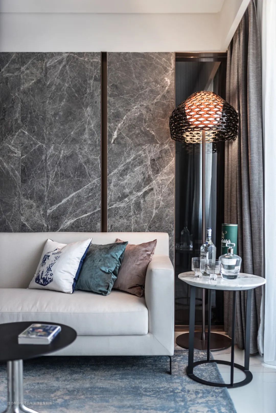 ▲灰色大理石质感的沙发墙,加入金属线条作为造型划分,布置米白色皮沙发,在素雅的抱枕与地毯装饰性。茶几与边几上精致的小饰品布置,带来一种潮流高级的现代档次。