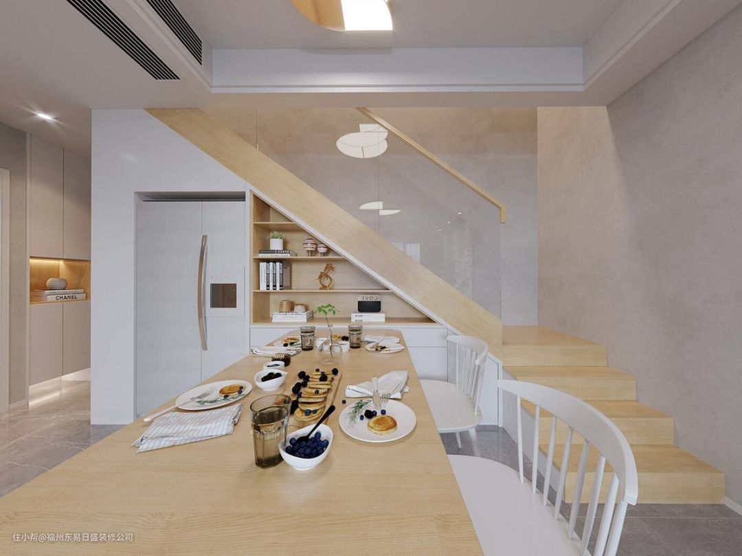 温润的原木色搭配木灰,温馨淡雅。楼梯边用餐区的打造让三餐富有仪式感,将吃饭与亲情养护融合一处。冰箱巧妙嵌入楼梯下方的位置,距离餐桌仅仅一步之遥。旁边多余的空间,做成收纳架,堪称完美摆位和空间开发利用!