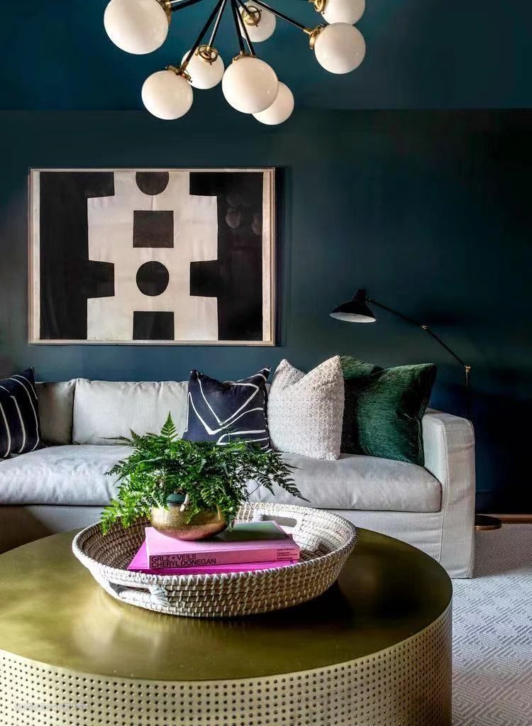 深蓝色给人一种大胆的感觉,但同时又很舒适,很适合与家人一起看电影、玩游戏的夜晚。把这种颜色带到天花板上,让房间感觉像是走进了一个特殊的地方,让大家聚在一起。