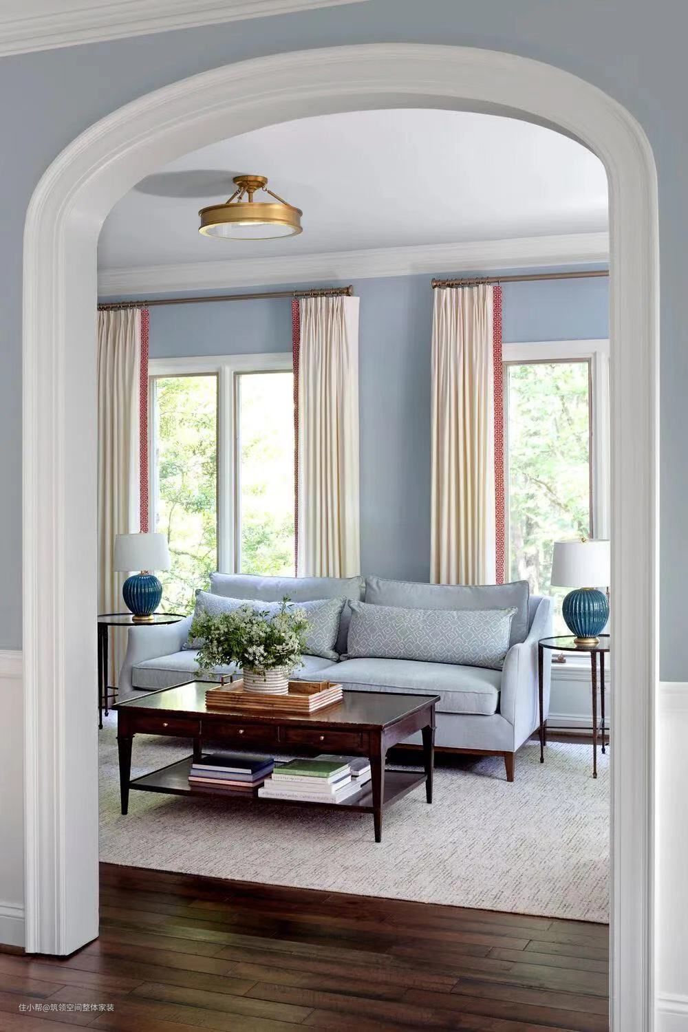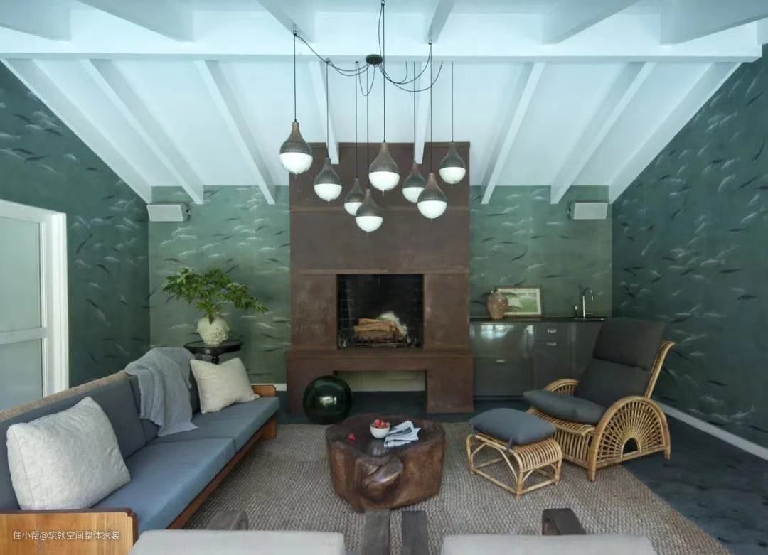 在这个房间中,设计师选择了这种银蓝色来与墙壁的颜色紧密搭配,并将这种让人平静的色调延续到天花板上。将天花板刷成与墙壁相似的颜色可以让房间感觉更大,而不是让你的眼睛停留在天花板上。这种柔和的粉状蓝色也类似于天空的颜色,与周围郁郁葱葱的风景相辅相成。