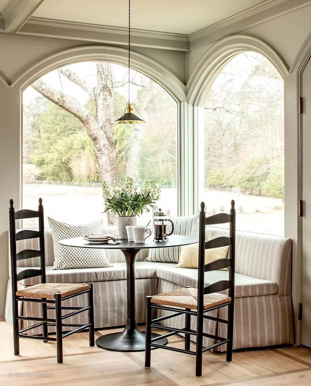 对于那些具有天花板横梁和建筑细节的空间来说,这种带有泥土色调的鼠尾草色是一个不错的选择。它让人感觉和谐自然,搭配适当的墙面和天花板造型,分层又诱人,非常适合享受早餐时光。
