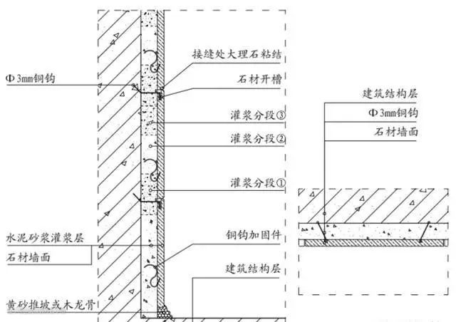 墙面石材采用湿挂灌浆工艺,采用铜丝连接。分次灌浆,第一次不得超过石板高度的三分之一,待砂浆初凝后进行第二次灌浆,高度为石板的二分之一。第三层灌浆至低于石板上口50mm处为止。