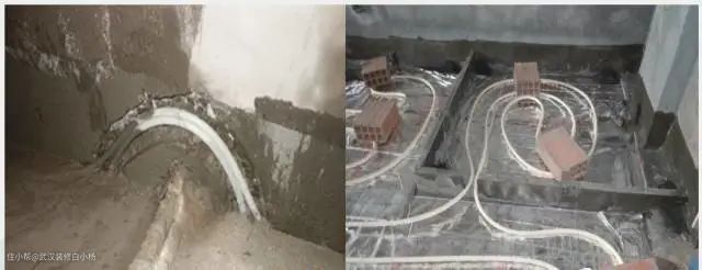 对穿过楼板的管道,应先将管道周边的孔洞凿毛,清理干净,再用细石混凝土分层浇捣填堵,细石混凝土完成面高于结构楼板10~20mm,管道周围200mm范围内涂刷聚合物水泥基防水涂料两道,作为局部防水加强。