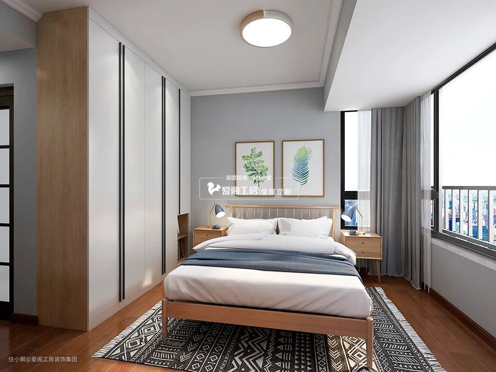 也有人因为床头柜而舍弃对开门衣柜、选择移门。如果将对开门衣柜下方挖空,就不必担心衣柜门和床头柜打架了,也增加了床头储物空间。