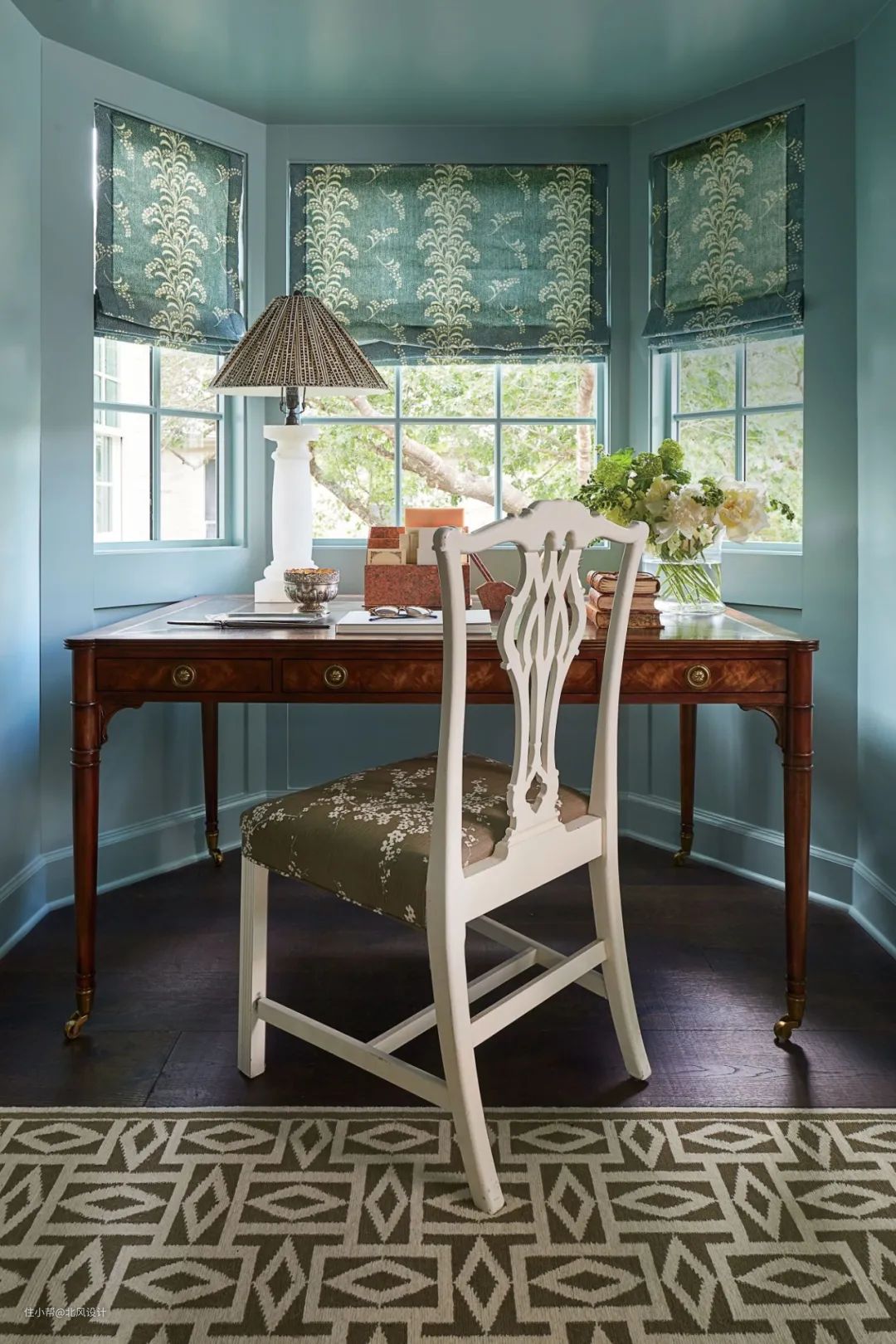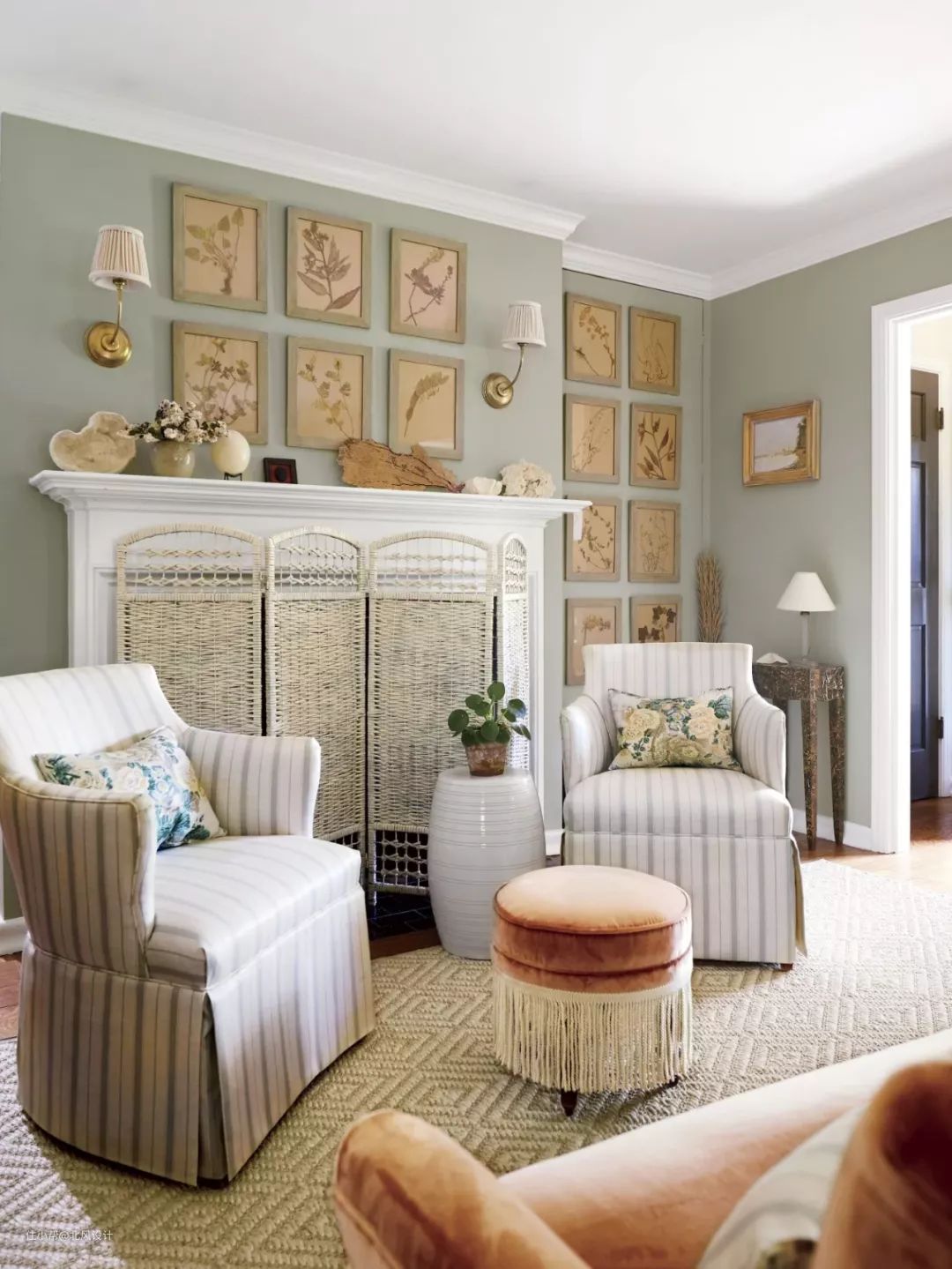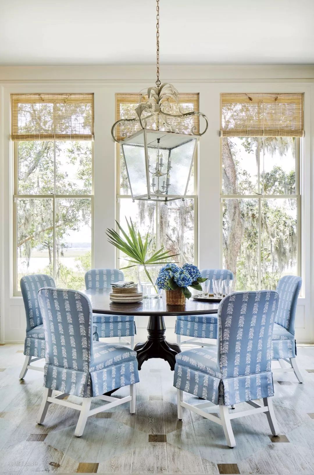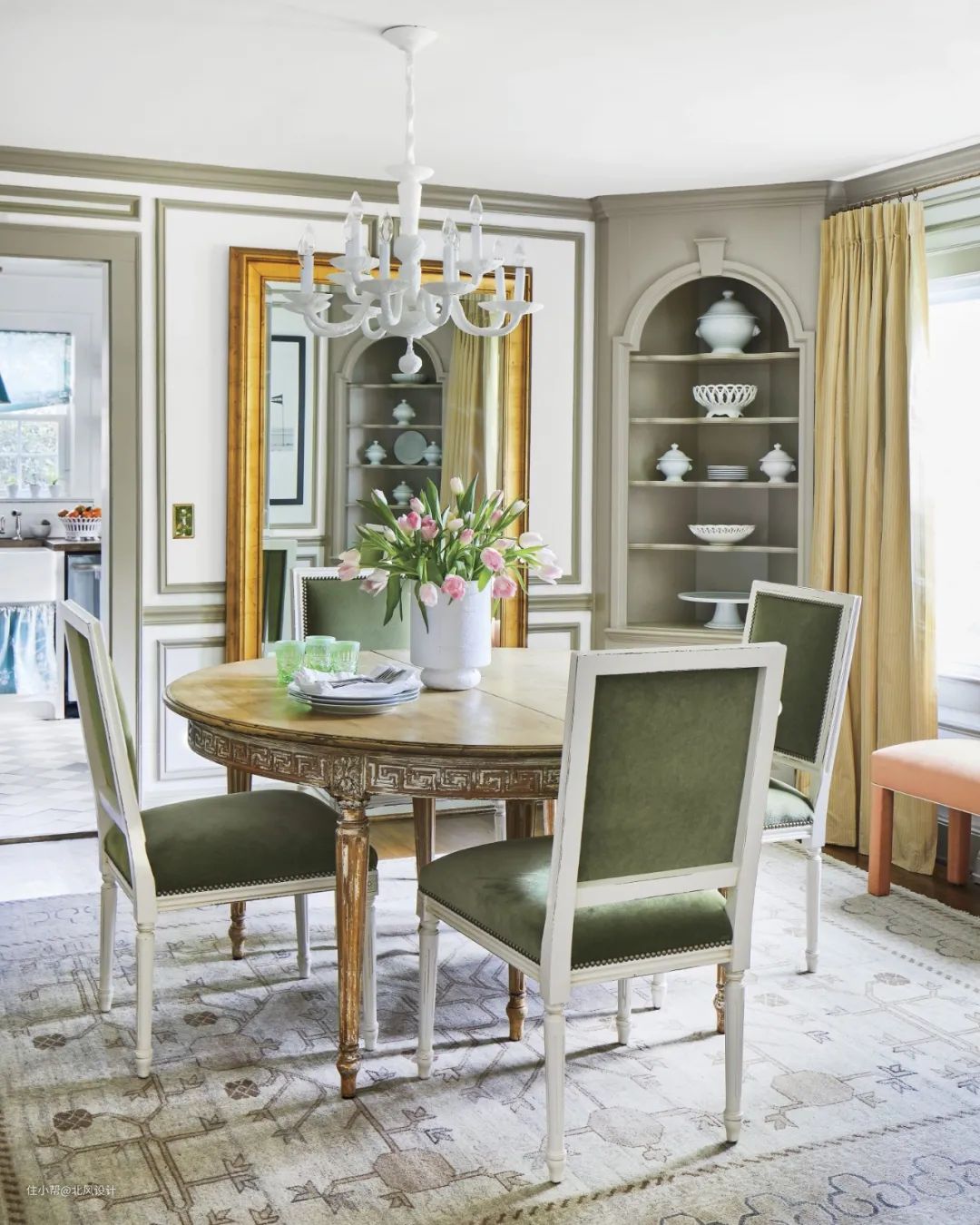 鼠尾草绿色就像一股清新的空气,给任何房间都带来一种古色古香的感觉。在南卡罗来纳州的这栋小屋中,设计师在普通石膏板上添加了几块造型板,并将艺术品挂在每一块板上,让餐厅看起来更正式,与古董家具相搭配。