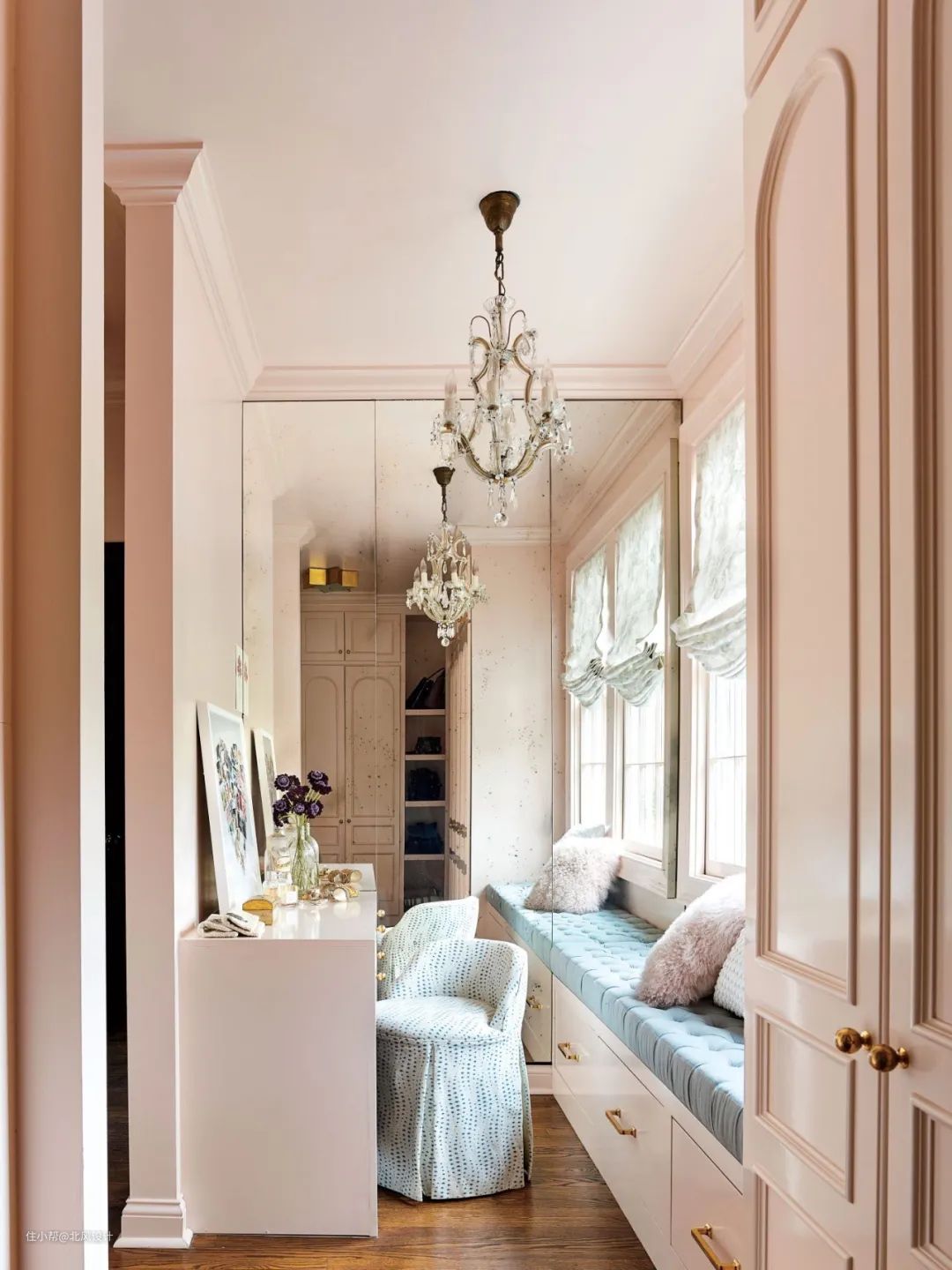 不要害怕“粉红色”,尤其是在装饰你的私人空间的时候。这间房子的主人把自己的衣橱和更衣室装扮成温暖的粉红色,让人感觉既平静又奢华。