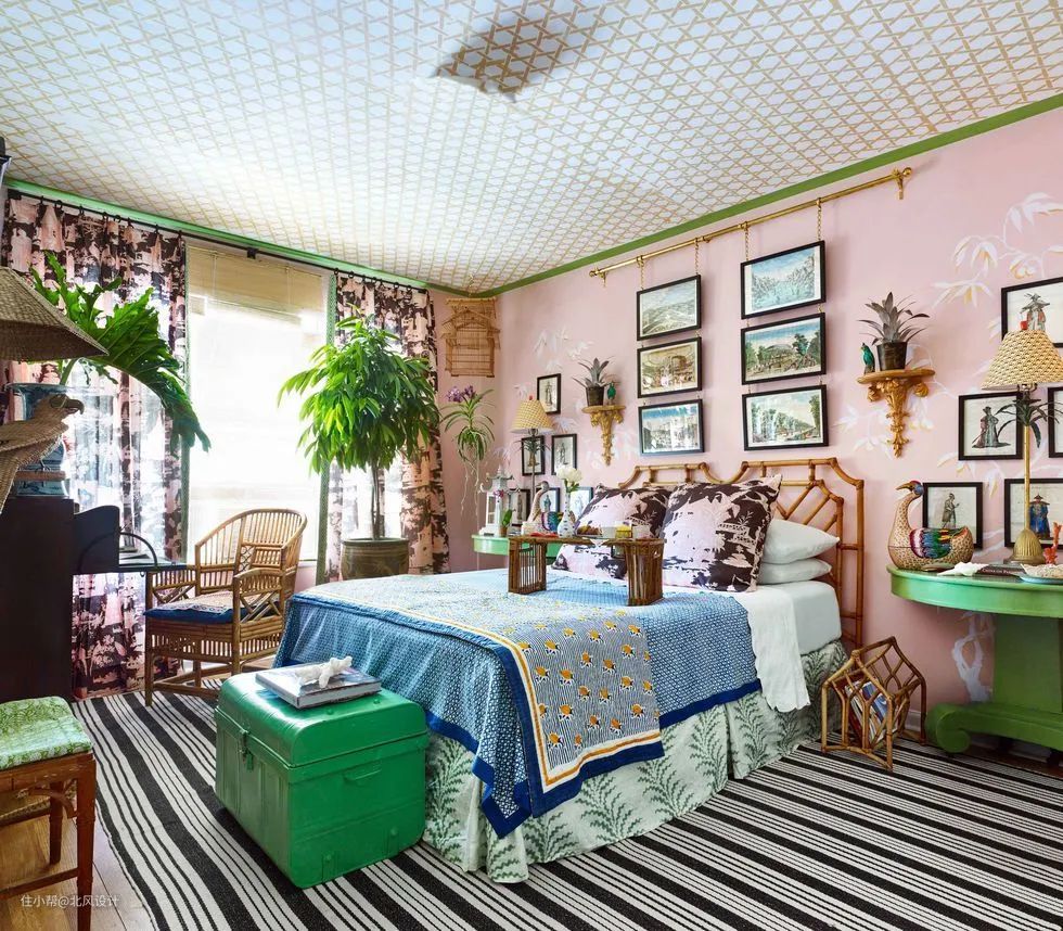一间田园气息扑面而来的卧室,浪漫而讲究的中国风情和手工定制的痕迹将它打造成了一个独一无二的假日天堂。天花板上手工绘制的藤条图案像是在模拟金丝笼,窗帘,床上用品和地毯充分使用印花面料,添加丰富的绿植和挂画,像一场来自森林的狂欢庆典。布莱顿风格的竹椅装点着舒适的角落,两个半圆形的绿色床头柜其实是由一张餐桌改造而成。