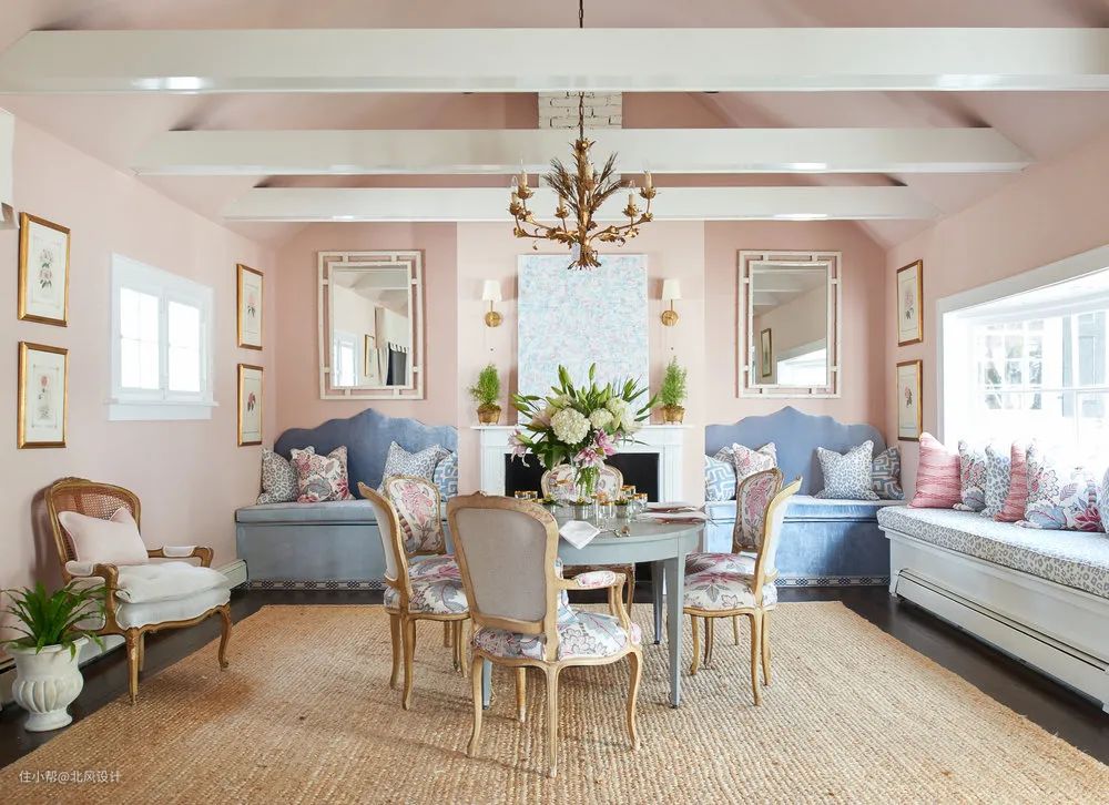 清甜的水晶玫瑰色总是能唤起一种飘逸的少女气息,使用同样柔和的蓝色来中和它,仿佛晨曦初升时的蓝天和泛彩的云朵。搭配亮白色和剑麻地毯,打造水晶田园的氛围。这间客厅拥有轻盈剔透的感觉,光滑的水晶玫瑰色墙壁被亮白色的镶边固定轮廓,两个黄昏蓝的嵌入式座位用简单的雕花镜子修饰,金色的配件闪耀在房间各处,带来成熟与性感。