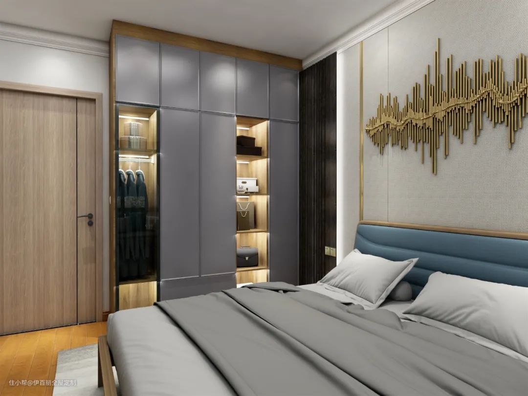 床头设计部分可以利用转角位置,定制L型衣柜提高空间利用率。