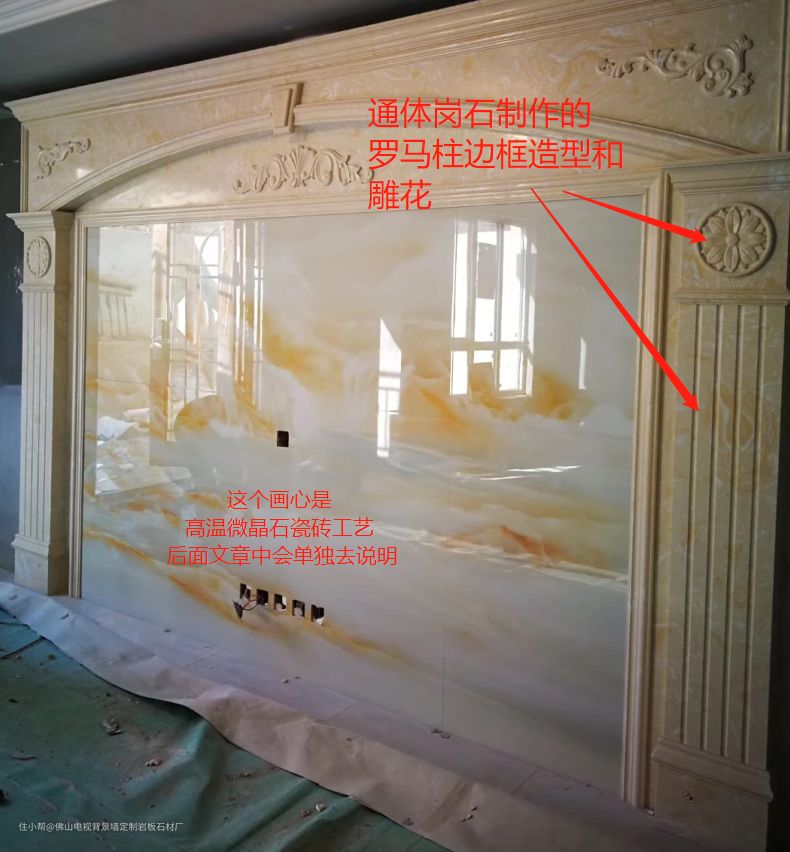 ③通体岗石:同样是属于岗石大理石,只是这种砖胚和砖表面都是通体连续的纹理,所以这个材料主要用刚在背景墙两边的柱子和雕花、石材线条上使用,大部分欧式轻奢罗马柱护墙板石材都是用这个材料,不同工厂品牌的石材,品质上都有些区别。