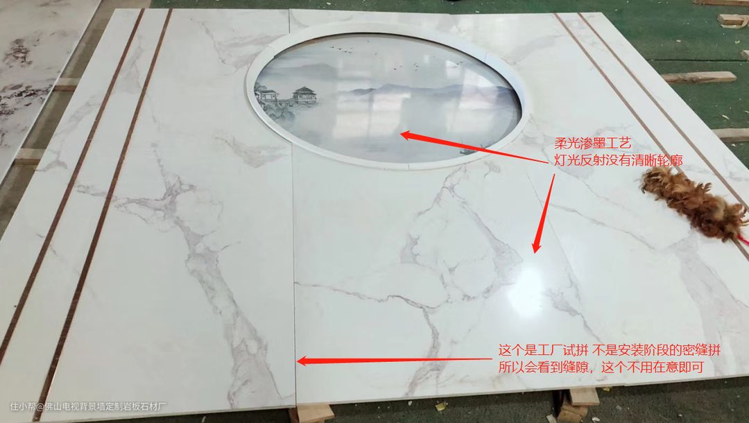 ②柔光-高温渗墨大板:是通过高温把纹理渗透入石材内,同样适用汉白玉岗石为胚料,表面亮度会比亮光水晶面低些,介于磨砂面和镜面之间的一个区别。