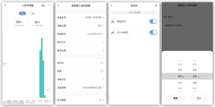 其联动配置方式和普通人体传感器完全相同,联动所支持的项目也类似,为“有人移动”和“一段时间无人移动”,时间的长短可以随意设置。当然,因为没有集成亮度传感器,所以不具备Aqara人体传感器的“有人移动且亮度暗”的联动项目。