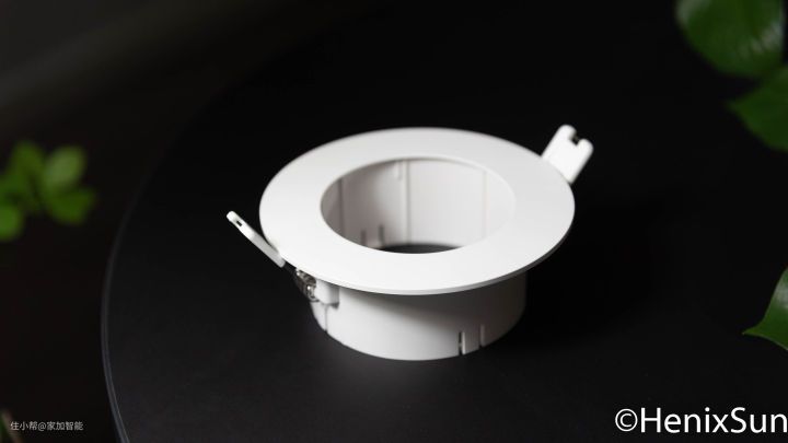 为了方便安装,提供了一个直径为113mm的套筒,套筒有和普通吸顶筒灯相同的卡扣。