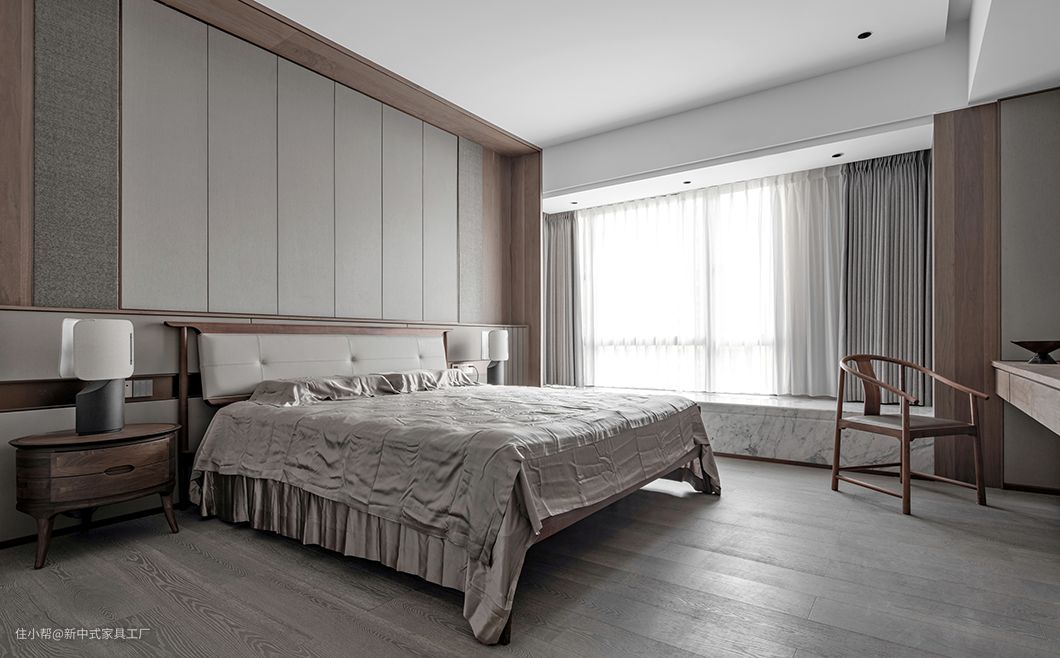 主卧以屏风框架造型作为背景,从地面到墙面再到顶面的延续让空间富有立体感。