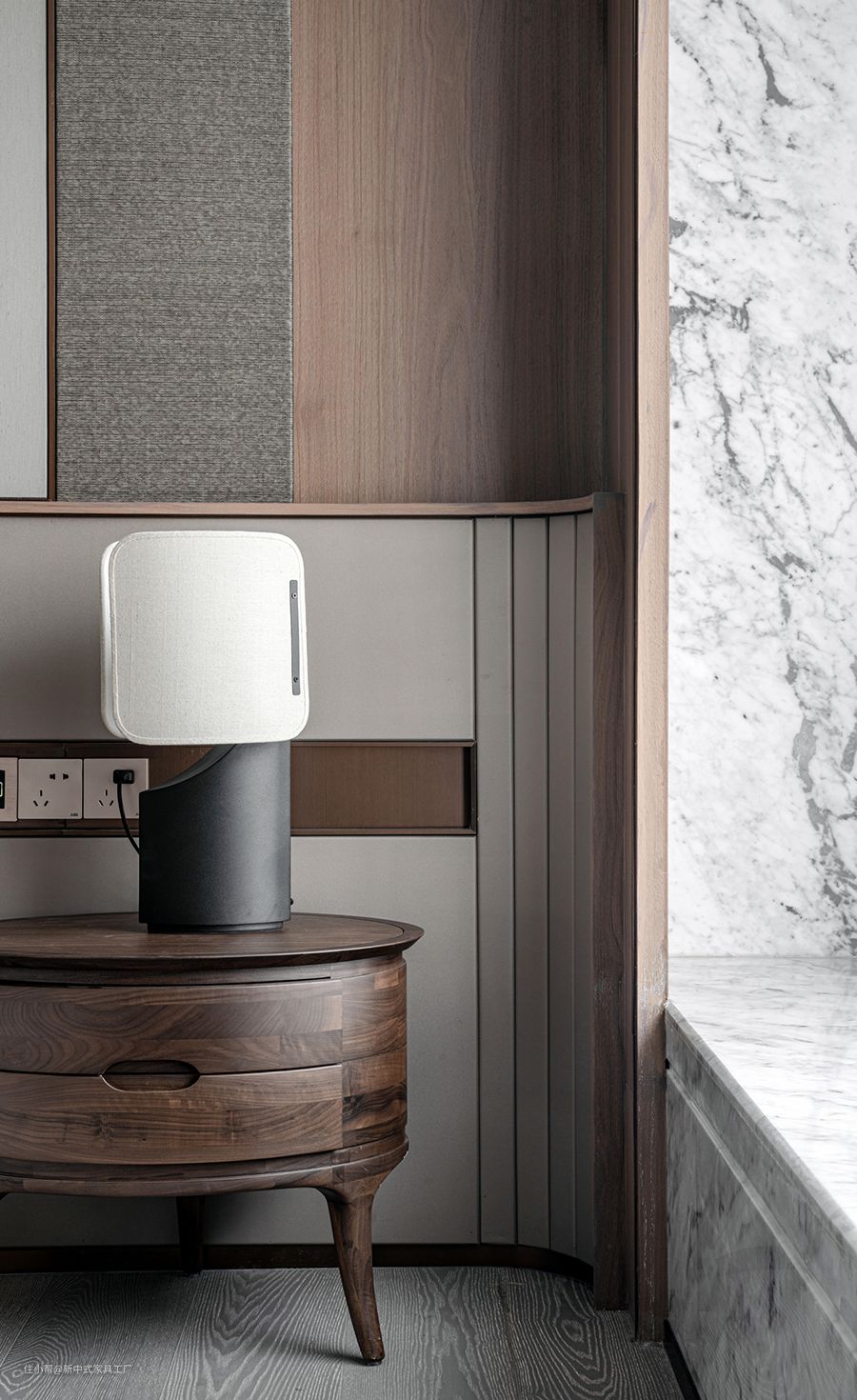 步入屋内,大理石与胡桃木定制造型的端景台与冷调定制墙画相互衬映,柔与刚、动与静之间赋予空间灵动的生命力,提炼宁静与安逸的环境和谐之美。