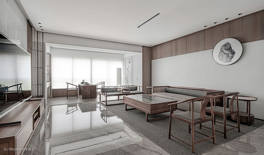 客厅天花板的设计随屏风造型作了直角拐点弧形处理,为新中式做了更好的诠释。