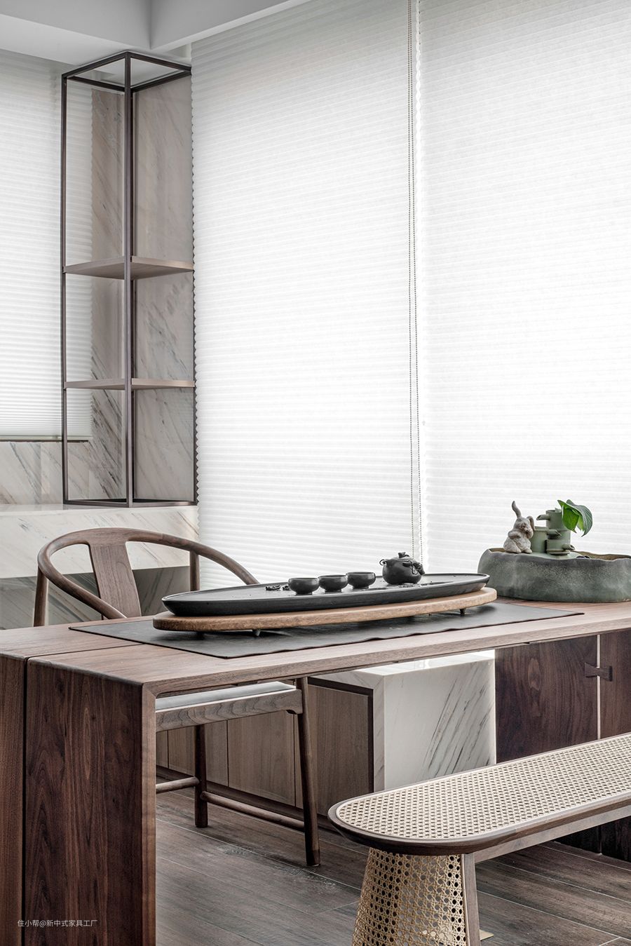 胡桃木色KD板、茶色不锈钢通花造型、浅灰色手工漆、林肯白天然大理石、细腻通透的夹丝玻璃隔断等材质的巧妙搭配,简约线条的新中式家具与定制意象墙画,皆为理性雅致的空间增添了几分艺术的从容。