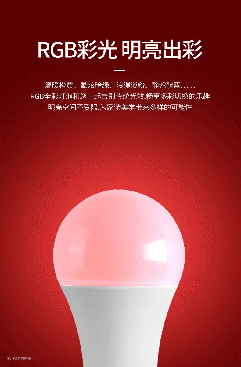 ▲E27螺口,9瓦全彩灯泡。APP多彩控制,适应多种场景彩色需求。