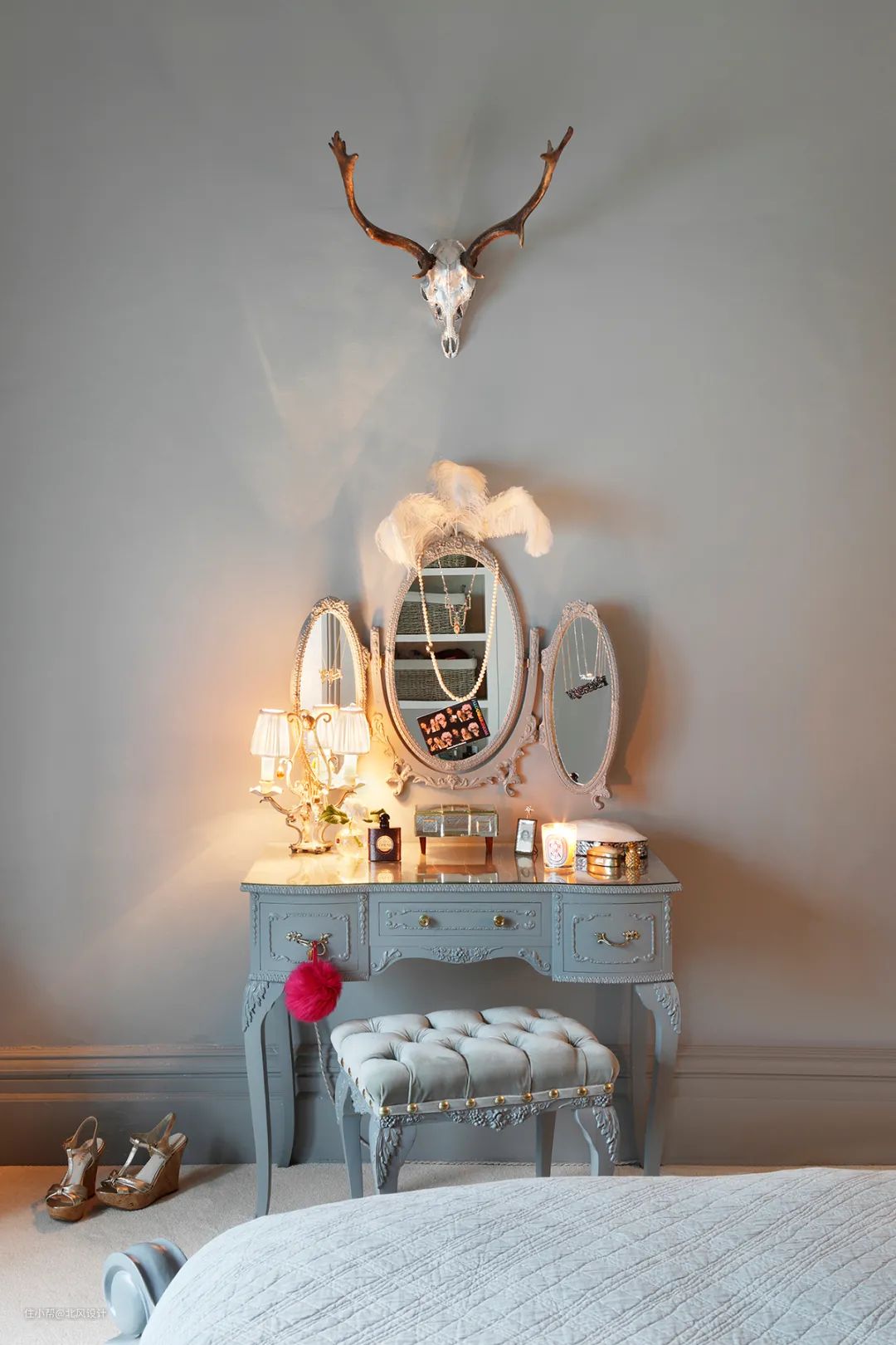 带有毛绒感的灰色背景让这间卧室显现出清冷可观的气质,橙色的床架和石膏镶边却打破了这种感觉,带来热情与活力。床上方的簇绒装饰为房间增添了柔软和蓬松的触感,用作床头柜的金属凳上方特意放置了蓝色的灯具,互补色的美妙碰撞在点缀中得到了微妙的发挥。