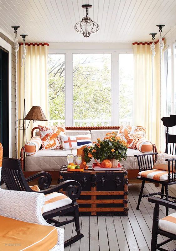 爱马仕橙在中性色的背景中即便一枝独秀,也可以营造出良好的家居氛围。这个阳台空间可以类比一个迷你的小客厅,亮白色的背景前使用暖黄色的窗帘,软化空间。木条拼接的天花板和地板,银白色的墙面,朝着一个洒脱不羁的农舍风格前进,复古的家具又充分利用了自然材质,并表达出直白的功能性诉求,从而打造出一个暖洋洋的中世纪风格空间。