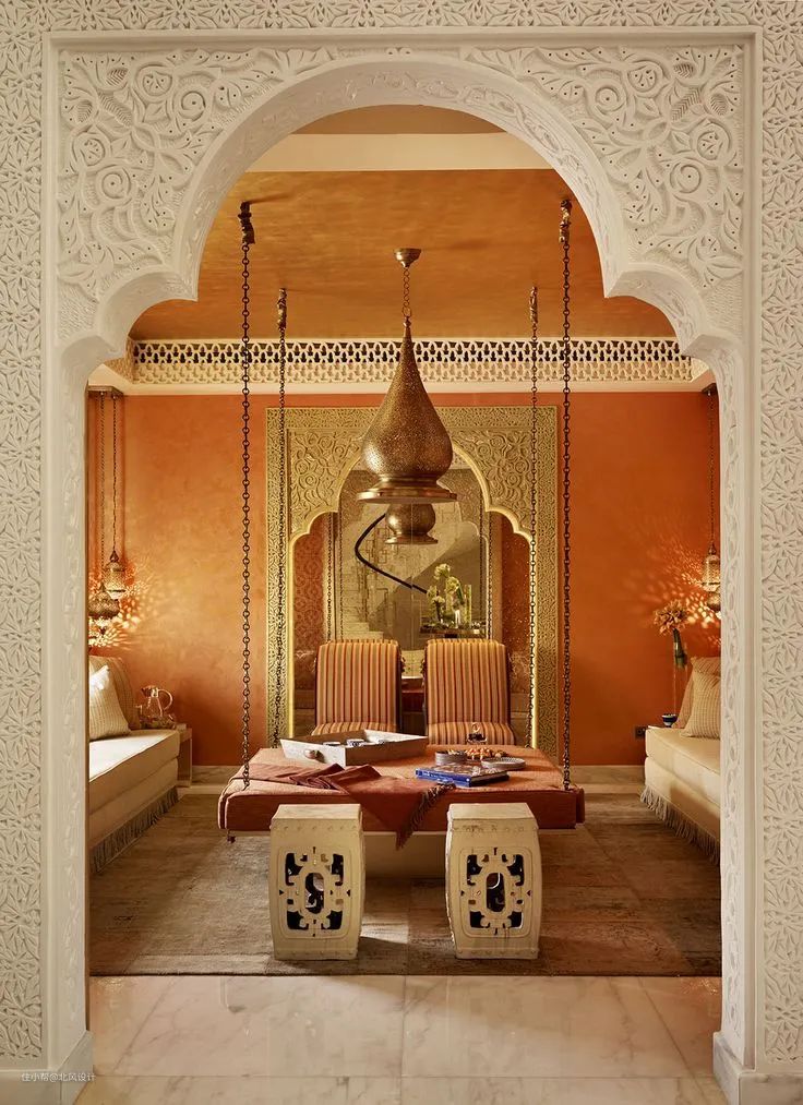 爱马仕橙与神秘多变的摩洛哥风格搭配,仿佛带我们去到一千零一夜的故事里。深夜,灯火通明,塔楼里的舞会,香料与美酒,人群在欢笑中起舞,瓶子里的妖怪在屋顶上交谈……哑光的背景墙即便颜色艳丽,在精致和细密的纹理衬托下,也变得低调谦逊,仿佛一卷古老的羊皮纸。