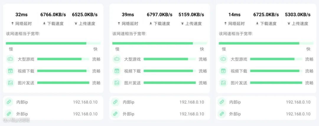 为了测试这款路由器的信号强度,我分别在主卧、洗手间以及客厅三个房间,进行了网速的测试,可以看到三个房间的网速基本一致。