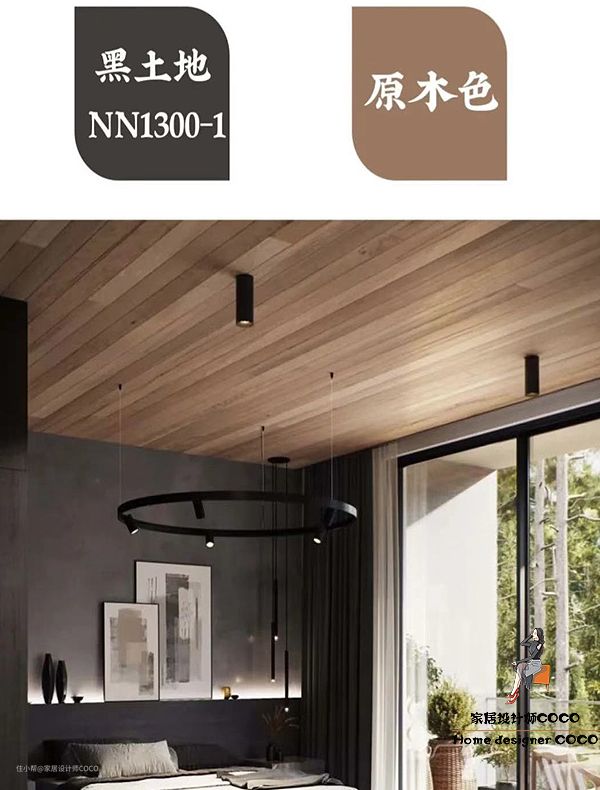 实木吊顶非常有质感,但是实木也比较跳跃,如果没有一款合适的墙面漆来搭配,会让空间显得头重脚轻,所以这款神秘的神色墙漆让空间充满了稳定感和时尚感。