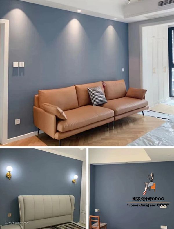 灰蓝色的色调适合背景墙的位置,可以搭配电视背景墙,床头背景墙,显得高贵典雅,同时,蓝色的属于冷色系,可以延伸空间,起到扩大空间的效果,和立邦的太空漫步是绝佳的搭配。