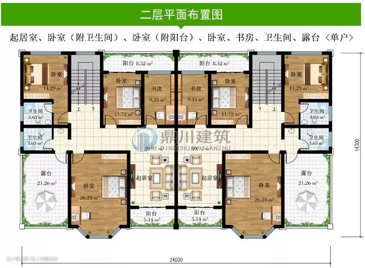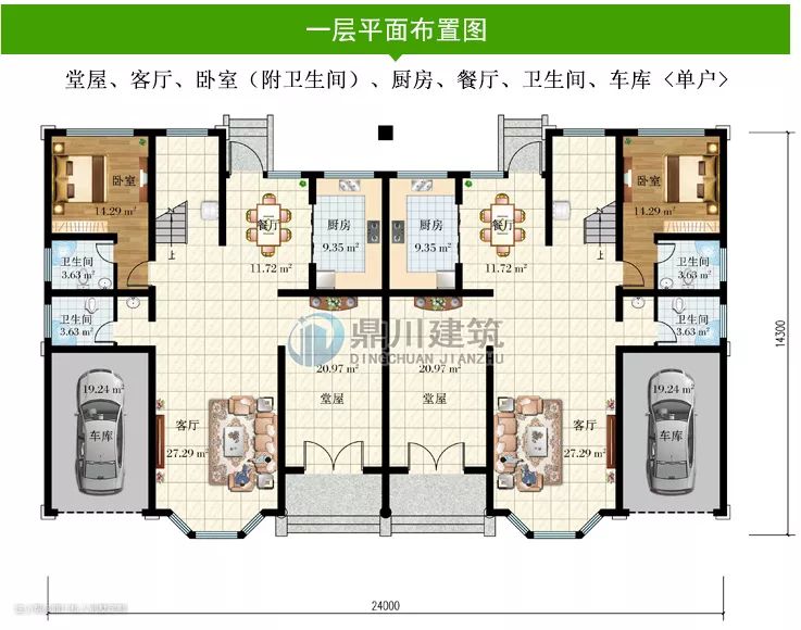 24米×14.3米,二层带堂屋双拼别墅,双户带车库,布局设计