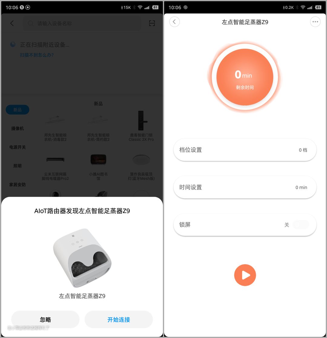 ▲原来Z9足蒸器还是智能的!蒸脚过程中,顺便把网络连接了,成功成为了米家的一员,以后可以直接用手机米家APP就可以操控Z9足蒸器。说说使用的感受。倒入清水和足蒸液之后,长按开机,足蒸器就启动了。开机后几秒貌似没听到什么声音,大概10秒左右貌似听到了水沸腾的声音,大片的蒸汽就从桶里边冒出来了,闻到了艾草的清香味。脚刚放进去的时候,因为足蒸器内部是仿鹅卵石面板,起到按摩脚底的作用,刚开始脚底感觉有点敏感,放一会儿之后就舒服得不要不要的。