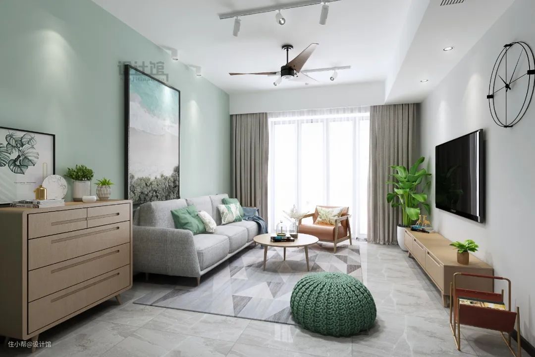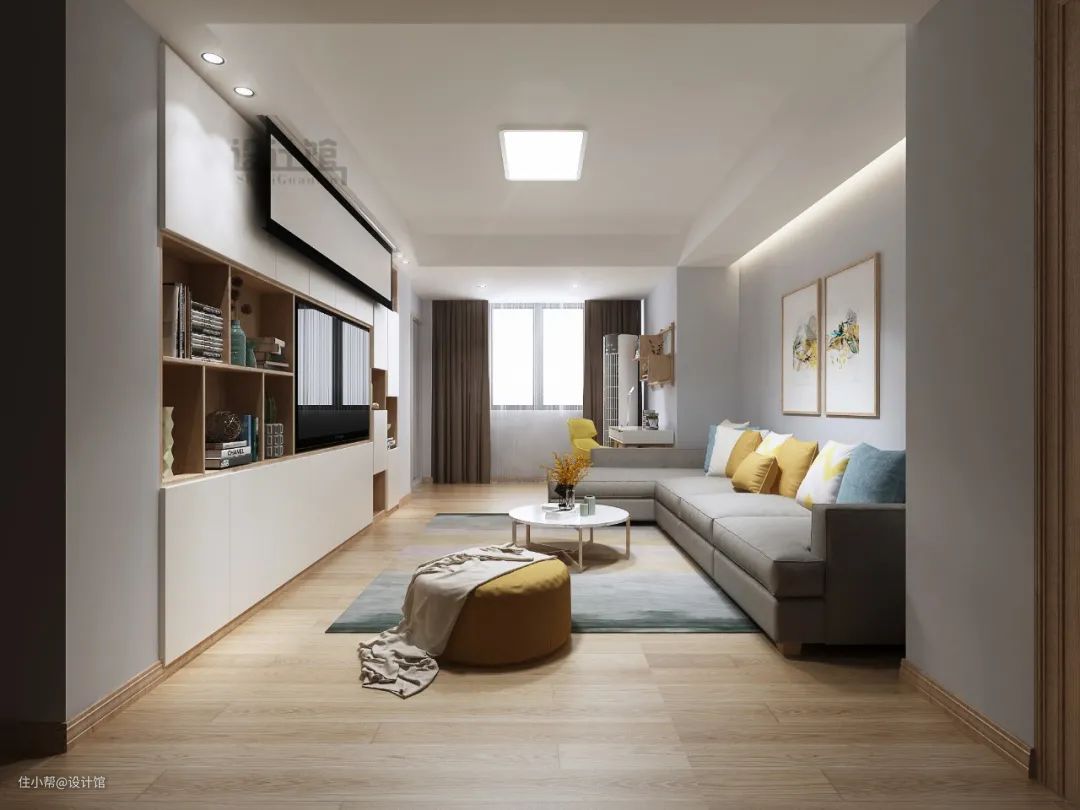 如果沙发墙两侧都是实体墙的话,那么在选择沙发的时候也可以选择对应尺寸的,这样摆放沙发的时候就可以将整个沙发都“卡进去”,让空间利用更加紧凑到位。