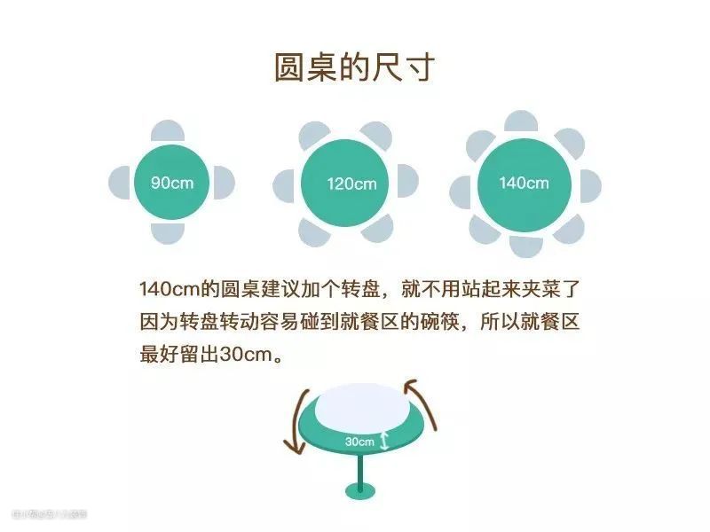 如果拥有视觉感较开阔的开放式或半开放式餐厅,建议选择圆餐桌,圆餐桌的尺寸通常是在五人位110cm、六人位125cm、八人位130cm、十人位150cm、十二人位180cm。