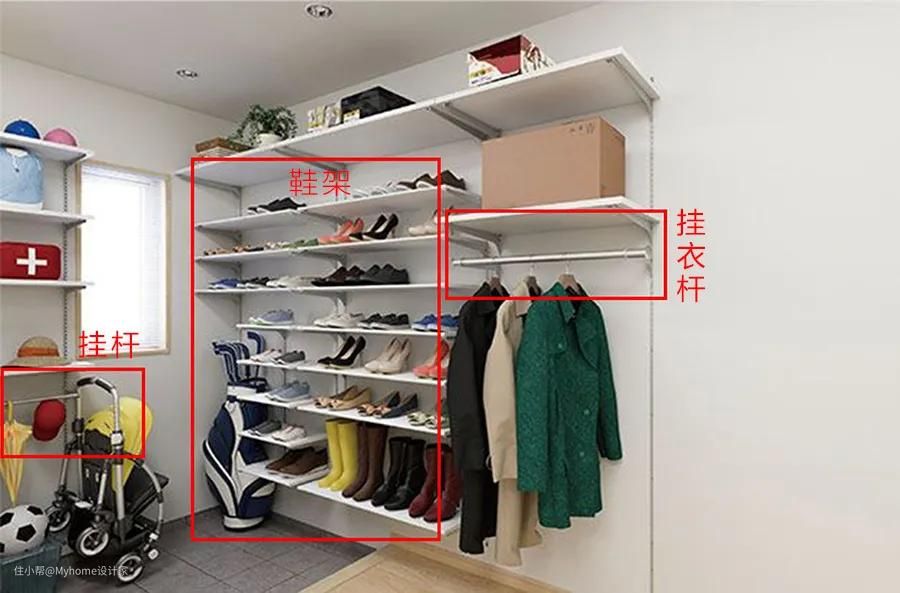 若有打造玄关储藏室(也称做"步入式储藏室"),则会特别针对不同的置物需求,安装不同的收纳工具。原则上,墙面会打造置物架(鞋架),当做收纳鞋子之用;另外还会会安排墙壁挂杆,除了作为吊挂外出衣服之用,也方便挂上帽子、雨伞。
