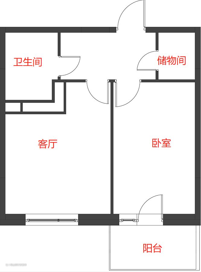先来看看原始结构图:面积不大,原户型开发商极尽分割能事,进门右手卫生间,左手有个储物间,客厅和厨房一体,另外一间则是单独的卧室空间,连接着阳台。