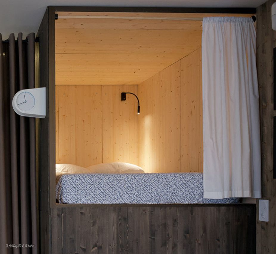 睡眠盒子的内部空间,统一松木制作,看起来非常日式,很温馨。