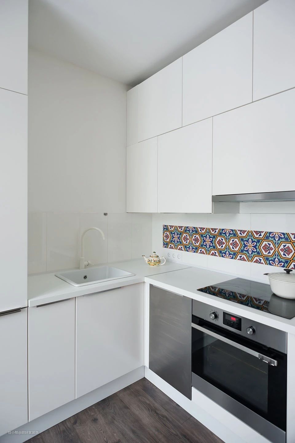 空间虽小但是功能齐全,面盆、灶台、洗碗机、消毒柜一应俱全。局部一行花哨的花砖点缀,瞬间惊艳厨房几平小空间。