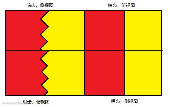 简单画一小区域,通过俯视和侧视区分明暗齿,不同颜色代表不同树木。