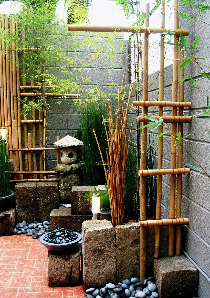 寻一个院子的角落,用竹子围起来,地面铺上沙石,摆上几块简单的石头,再搭配几株绿植。不管要不要围上竹阑珊,都能如此的好看。