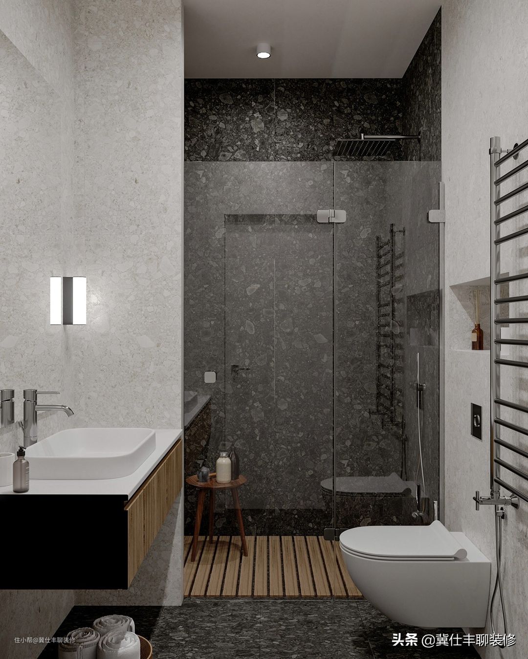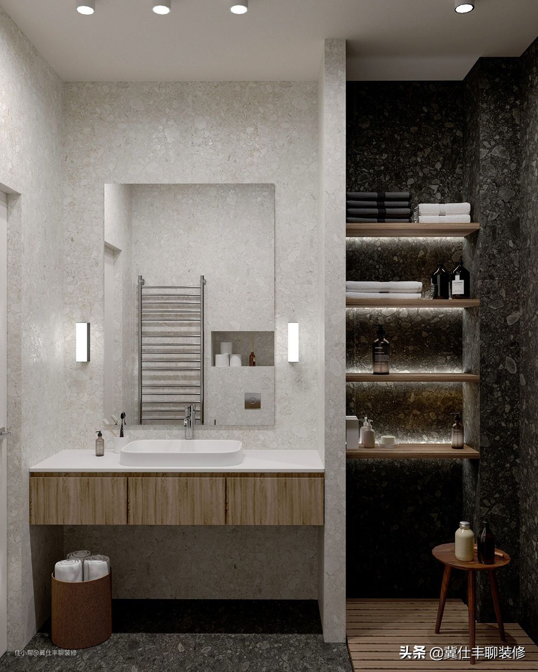 ▲ 原木色的色调在卫生间继续采用,而高级灰的材质在这里却变成了水磨石,浅灰色和深灰色的搭配,体现了卫生间的分区边界,也表现了不同的层次,让这个空间更有设计感。