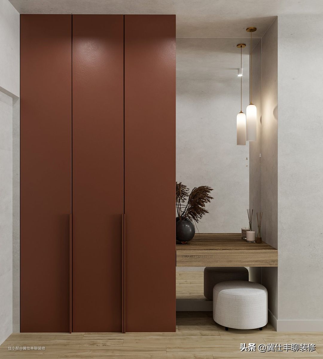 ▲ 玄关地面铺设浅木色地板,墙面和顶面全部选择浅灰色水泥漆,而深紫色的玄关柜显得非常突出,与一旁的木色置物台相连,简单,却格调十足。
